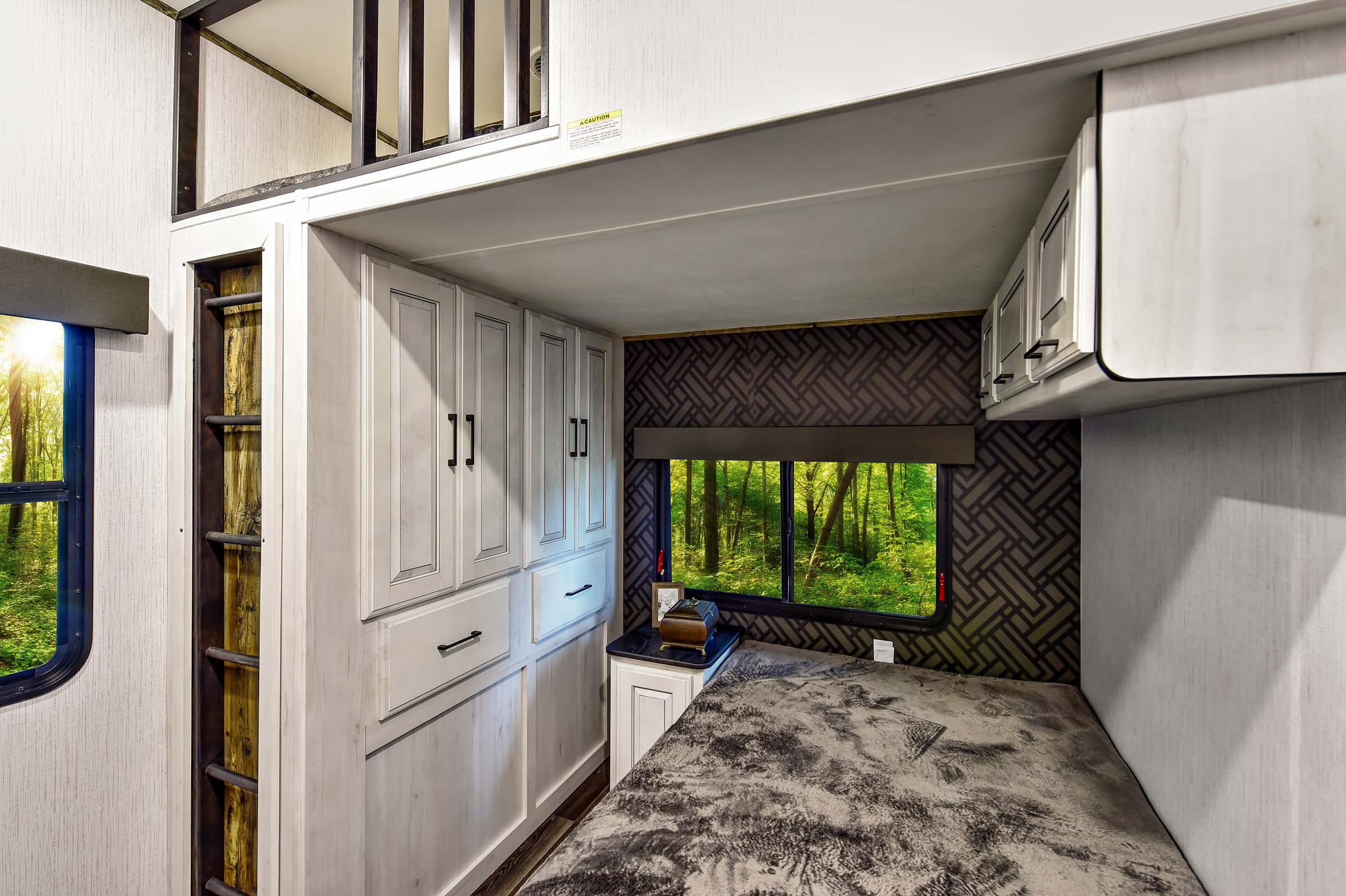 Middle bunk rooms are a great fifth wheel feature because they can double as a den. You’ll get bunks or a fold-out bed, often with an additional loft space above the room. Because they include a door, they’re a great place for kids to play or rest indoors – on rainy days, say, or if they’re too small to be left unsupervised outside. And many middle bunkhouses also include a TV or TV prep, giving you the flexibility to watch the big game in one room and cartoons in another.