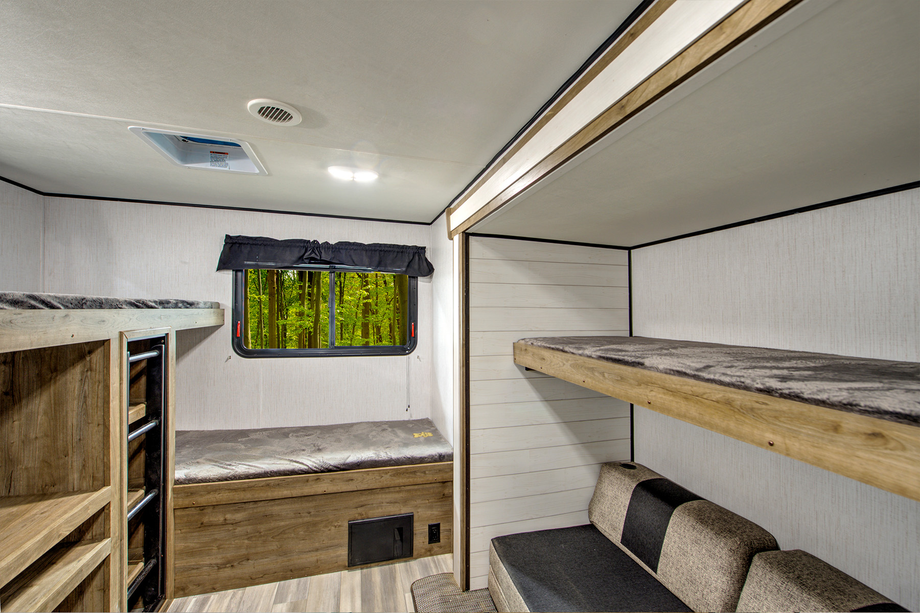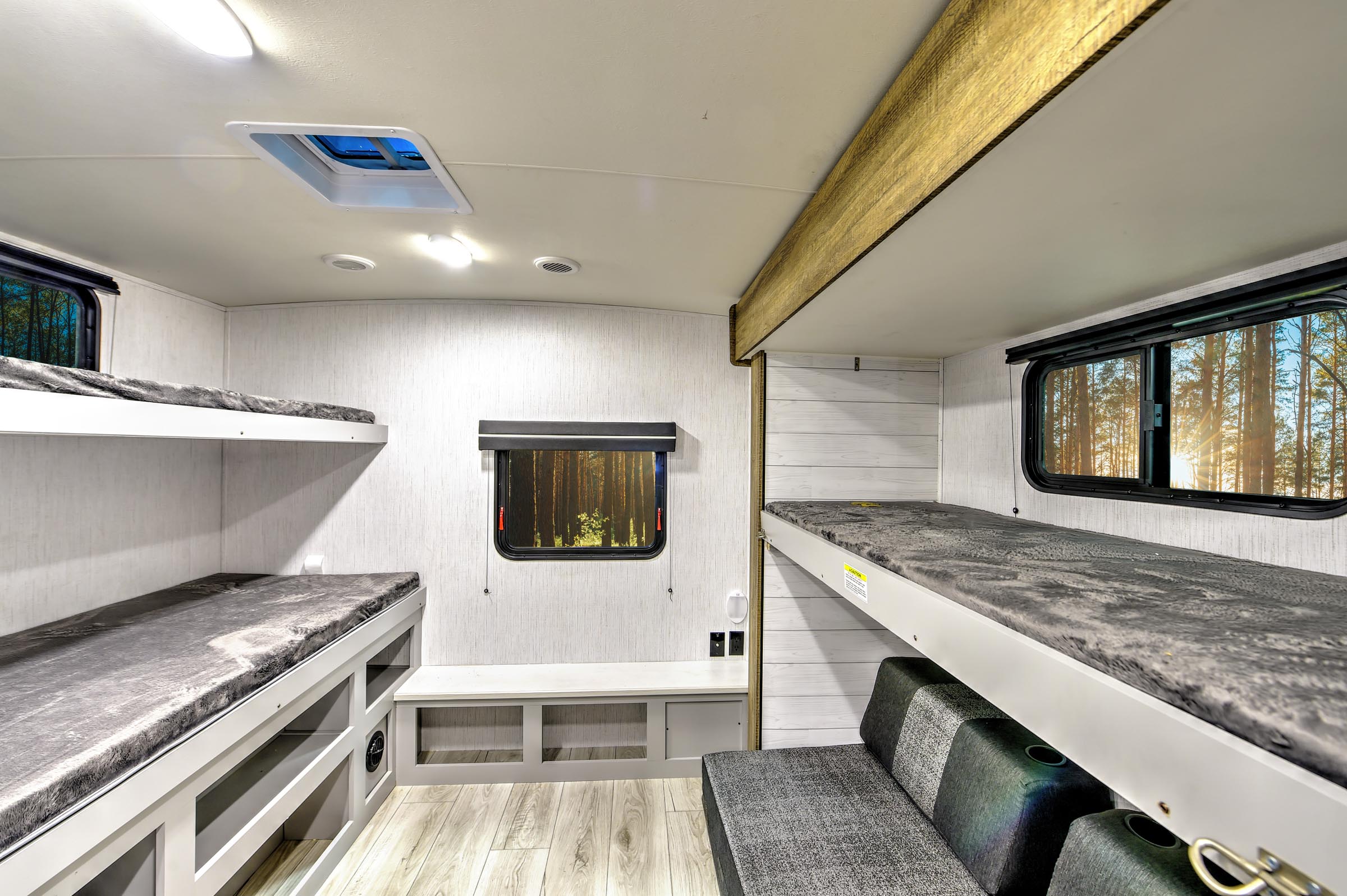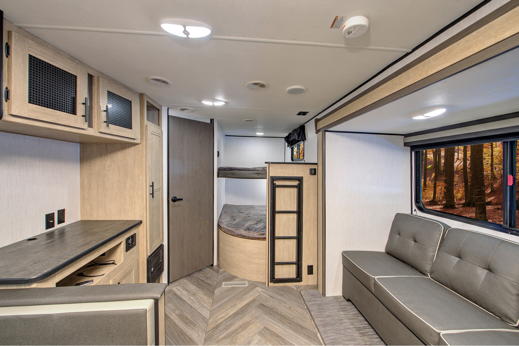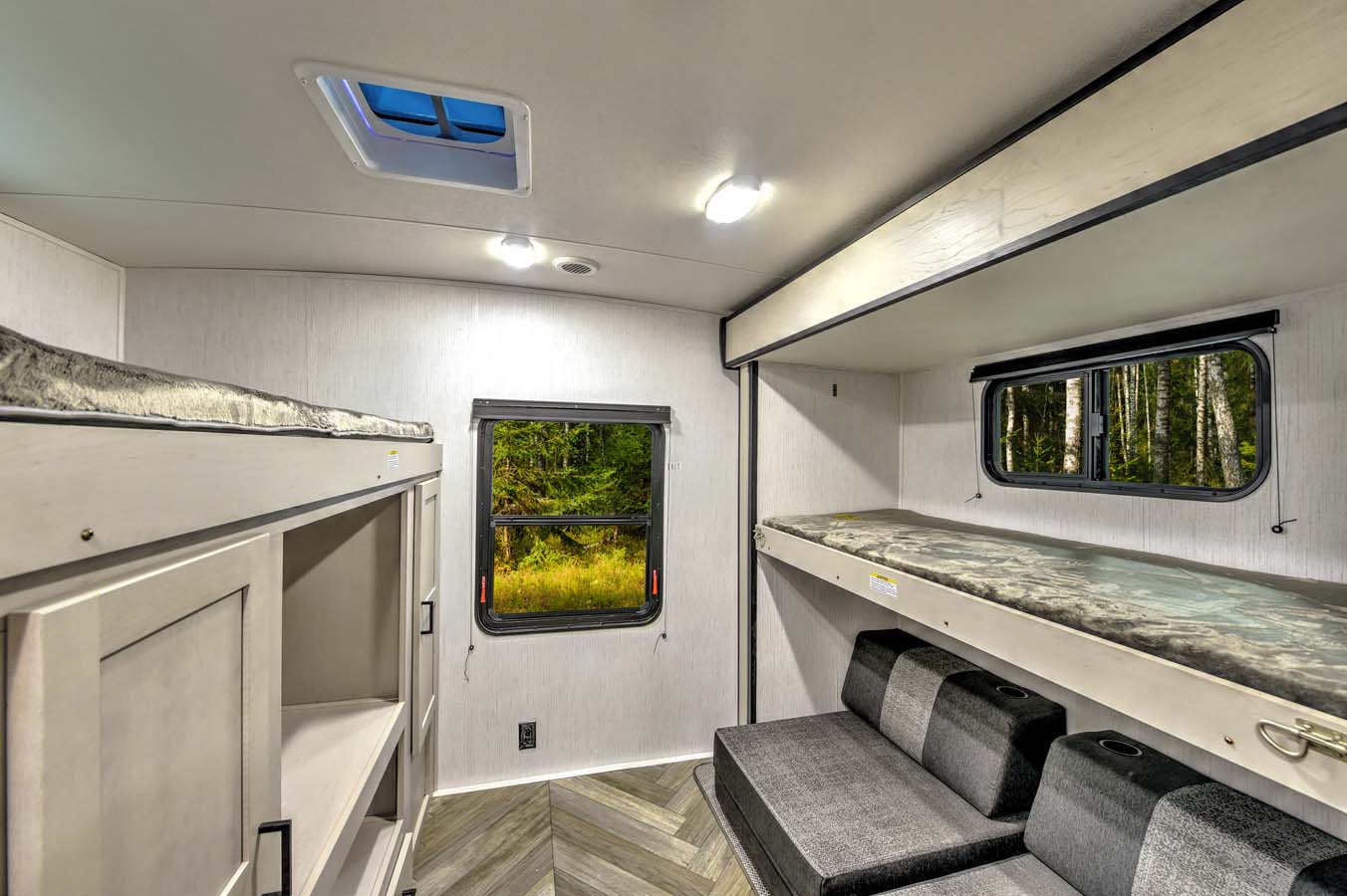 With main bedrooms in the front of the coach and bunkhouses in the rear, these fifth wheel layouts offer improved privacy and quiet at night. Rear bunks with lofts offer separate spaces for kids to spread out and store their things, thanks to the bonus ceiling height. And these models also include access to a second half-bath in the bunkhouse. That means easier bathroom access for kids, more privacy for parents and fewer disturbances at night.