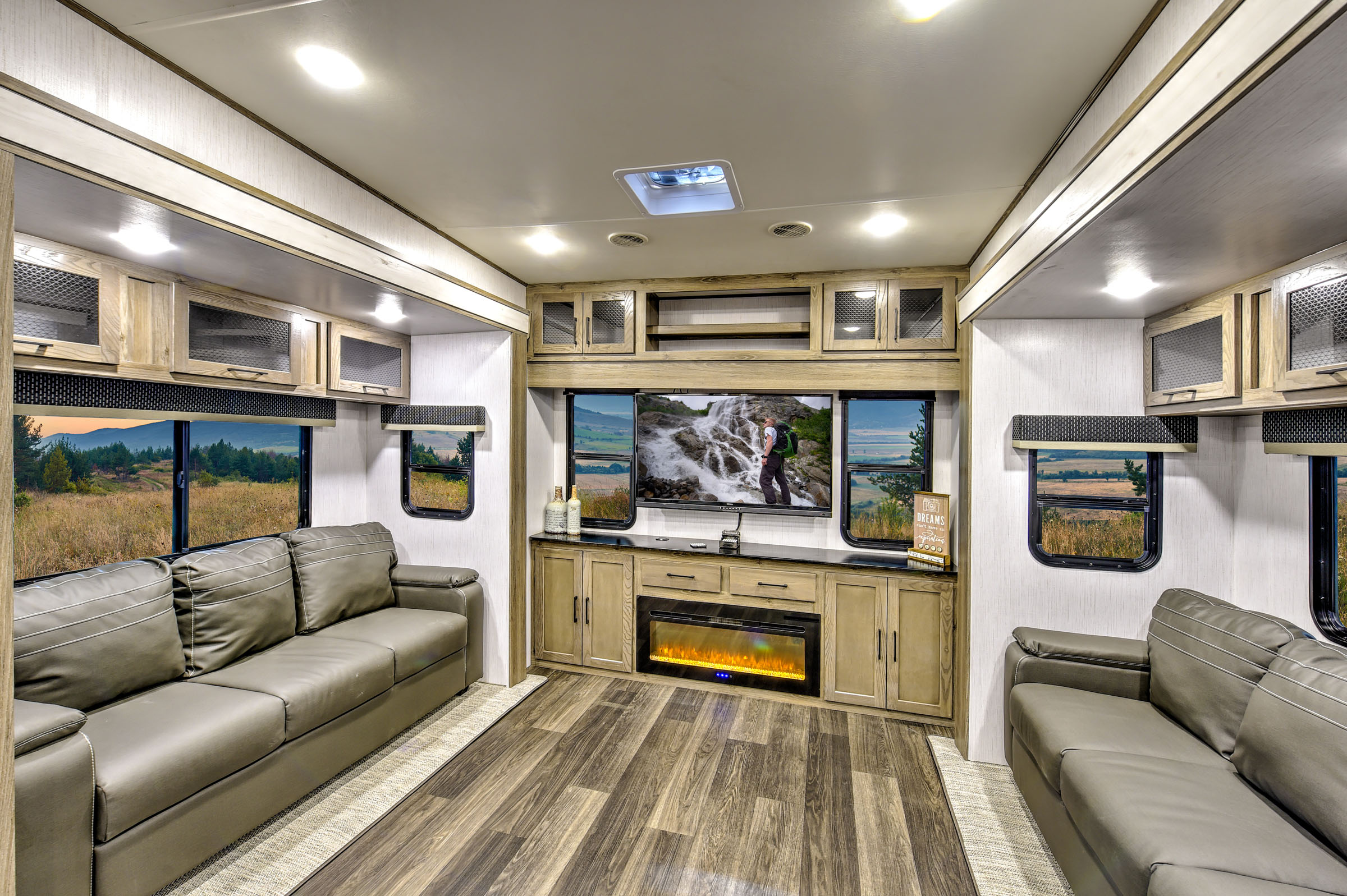 The whole point of camping with the family is spending time together, right? These next fifth wheels agree. Some RVs have tight layouts that make it challenging to fit a big family in one area. But fifth wheels with big living rooms make it easy to gather together and watch a movie, play a game or snuggle up on the couch together. There are two layouts we want to highlight – front living areas and rear living areas. Both have their charms, but you may find one suits your family best.