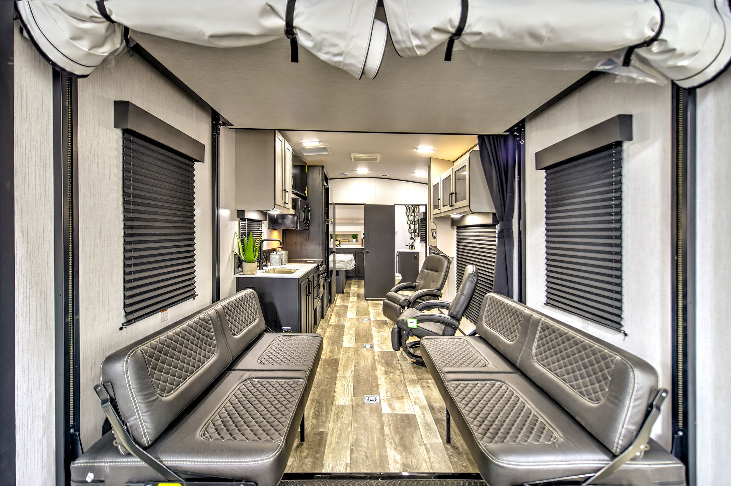 The most obvious use for a toy hauler is, you guessed it, hauling toys. With garages designed to secure and move motorized toys, you get benefits like frame-welded tie-downs, diamond-plated ramps and space for things like ATVs or side-by-sides. But many families use toy haulers for the additional space they provide. An empty garage can transform into a playroom, a bedroom, a home office, a workout studio or a mobile classroom. Rear ramps convert to patios that provide fenced-in outdoor space, so you can safely corral small children or pets while allowing them to get some fresh air. And garages can store non-motorized toys, like bikes for the whole family, kayaks, paddle boards, etc. With the flexibility to make them whatever you need them to be, toy haulers are a popular choice for long-haul travelers and their families.
