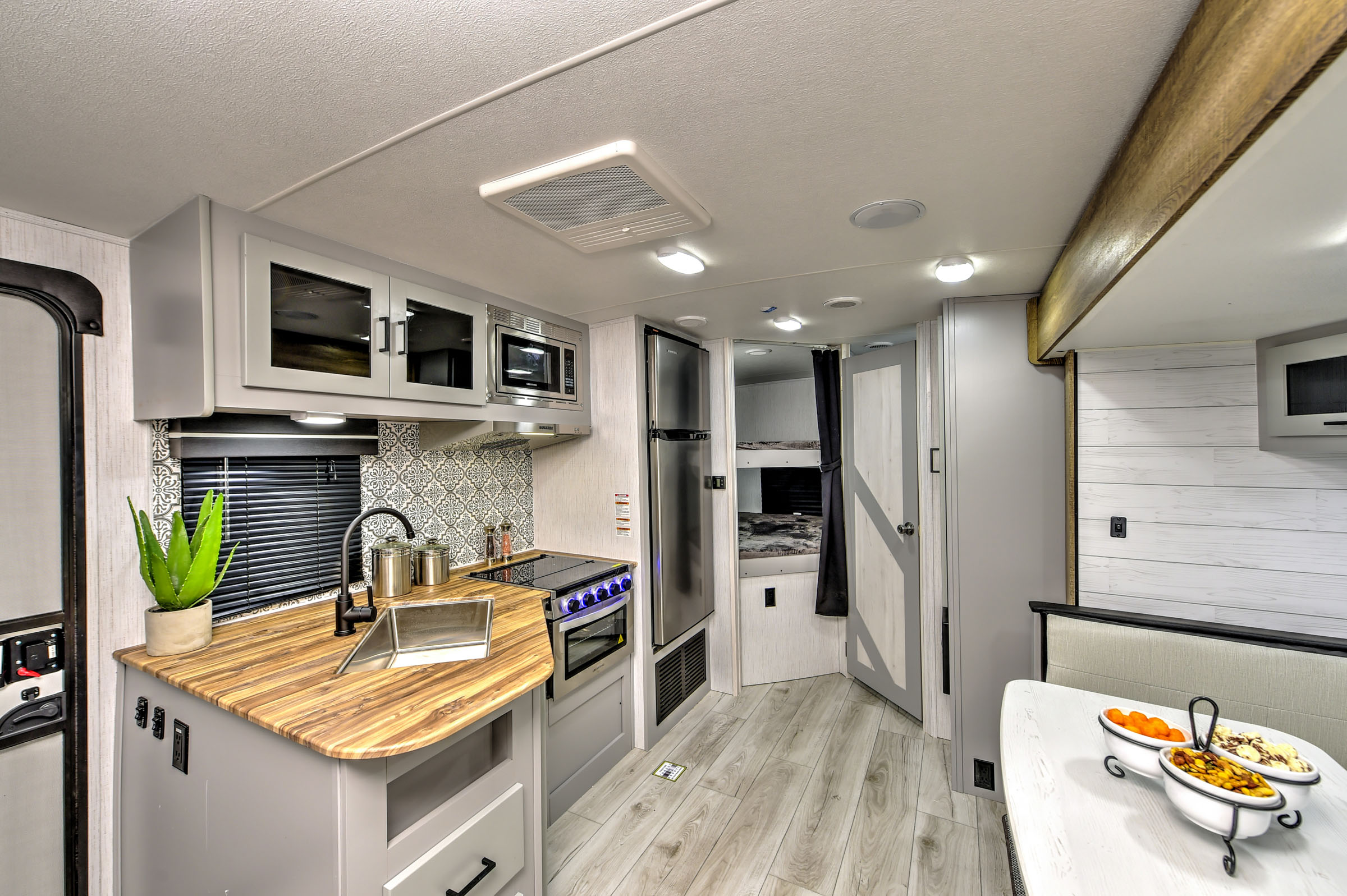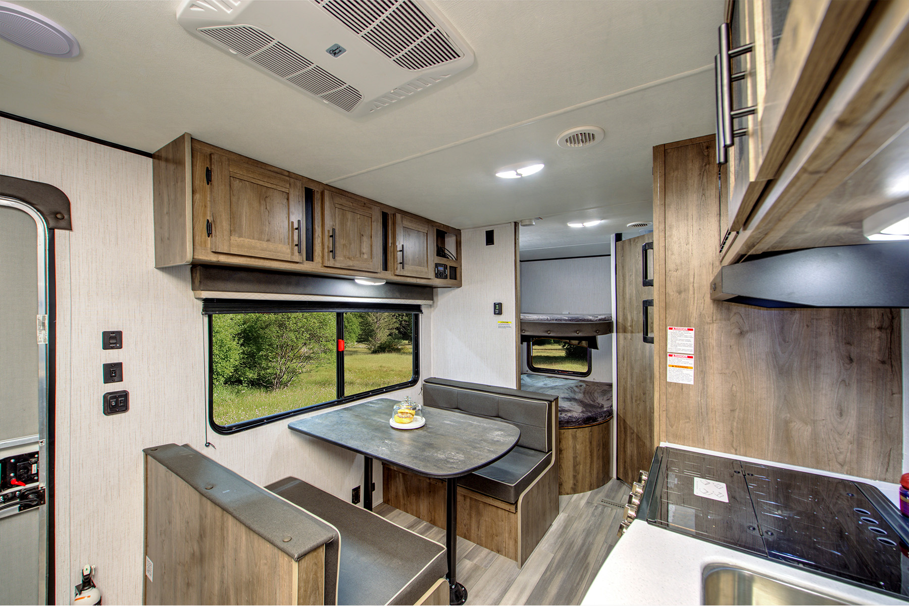 If you’re looking for a smaller travel trailer model that’s easier to maneuver or store, we’ve got you covered. Some of our smallest models are less than 24 feet long and still fit beds for up to 8 people. Small doesn’t have to mean less – with a cleverly designed floor plan, small travel trailers give you outsized amenities in a more compact footprint.