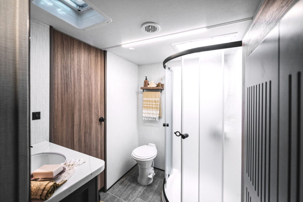 As for towability, Corterra features robust 7000# Dexter axles and American-made Goodyear tires, already equipped with a tire pressure monitoring system. The only thing the Corterra doesn’t have are the two bonuses the Lahrs hoped for, a built-in dishwasher and a bathtub suitable for soaking.