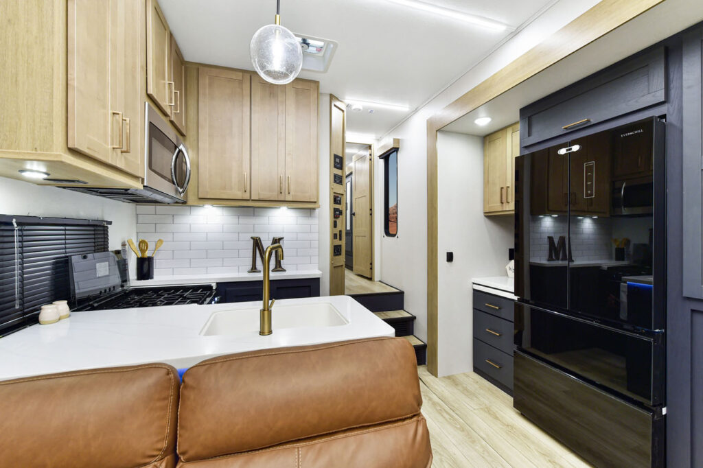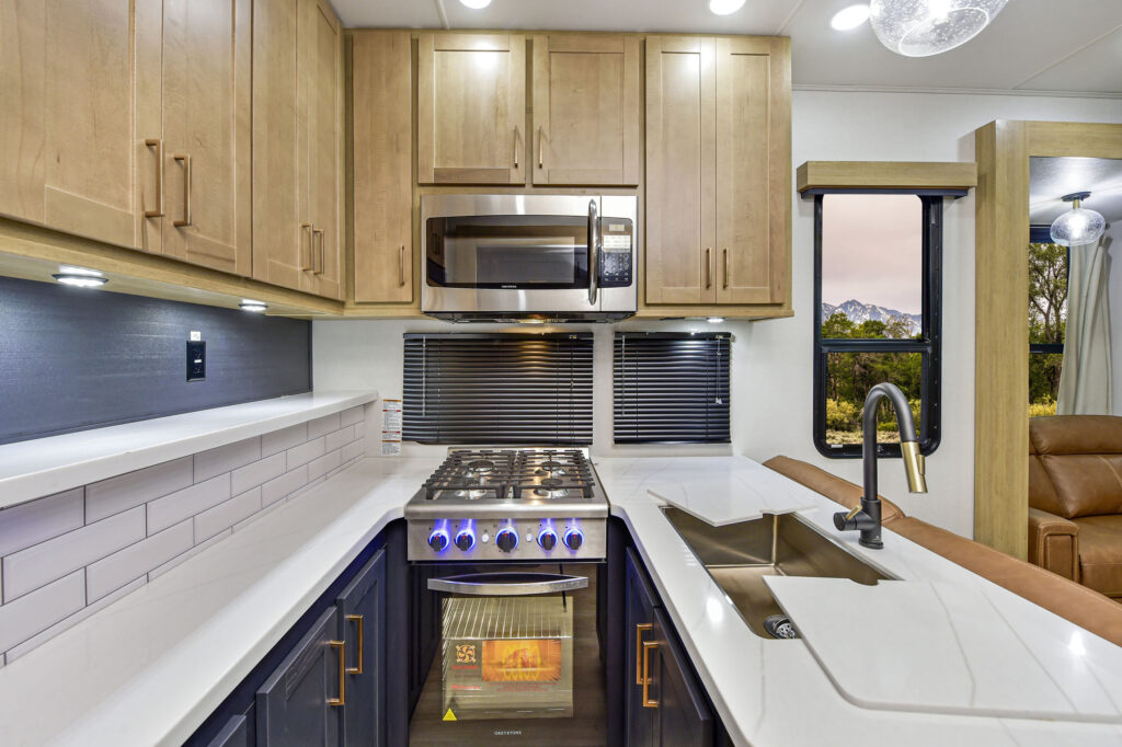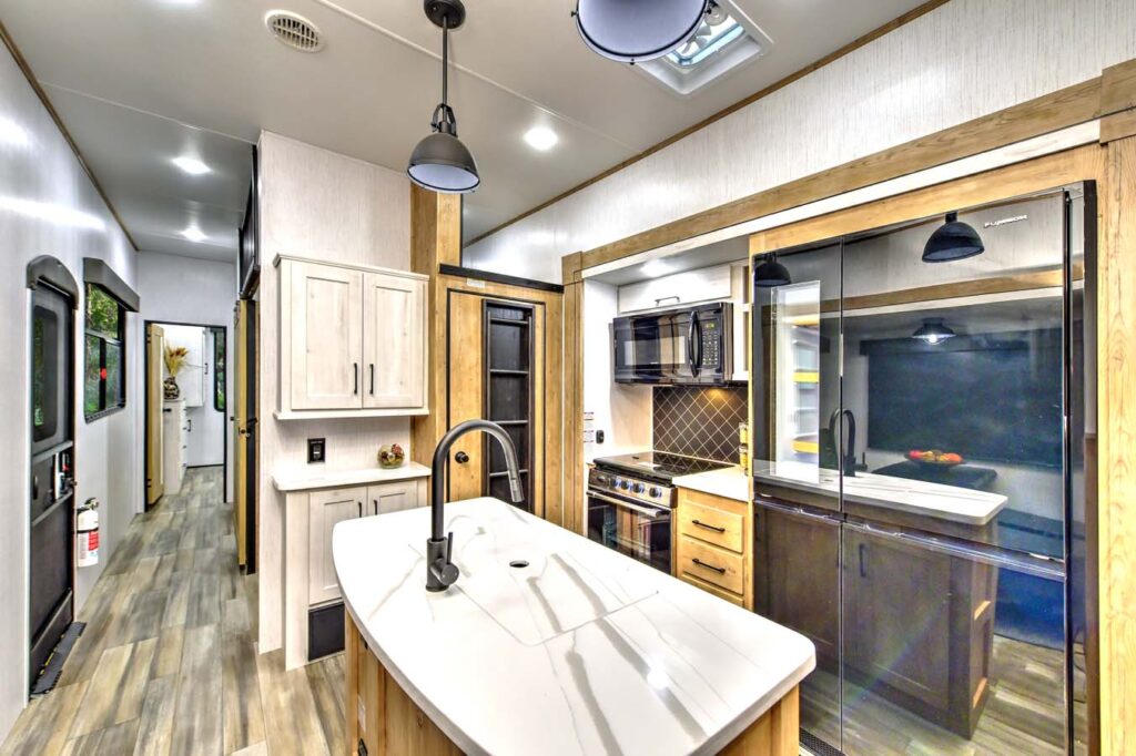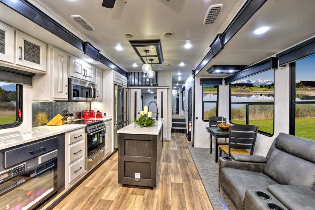 The kitchen includes a full-sized, stainless steel fridge, an oven, a microwave, and a kitchen island with a sink – everything they need to cook up their favorite meals, just like at home. The light gray interior color palette maximizes all the natural light streaming through the windows, giving the coach an airy, serene feel that makes it easy to relax.