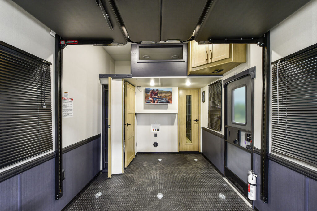 All our Bighorn models come standard with built-in dishwashers, including the Bighorn 3880MD. Like Corterra, this model features a mid-coach bunkhouse with a fold-out couch, desk, and wardrobe below, and a spacious loft above. The living area includes seating for five, with two power theater seats offering heat and massage functions. A 55-inch LED television is installed on a televator, so you can just press a button and lower it into the cabinet when it’s not in use.