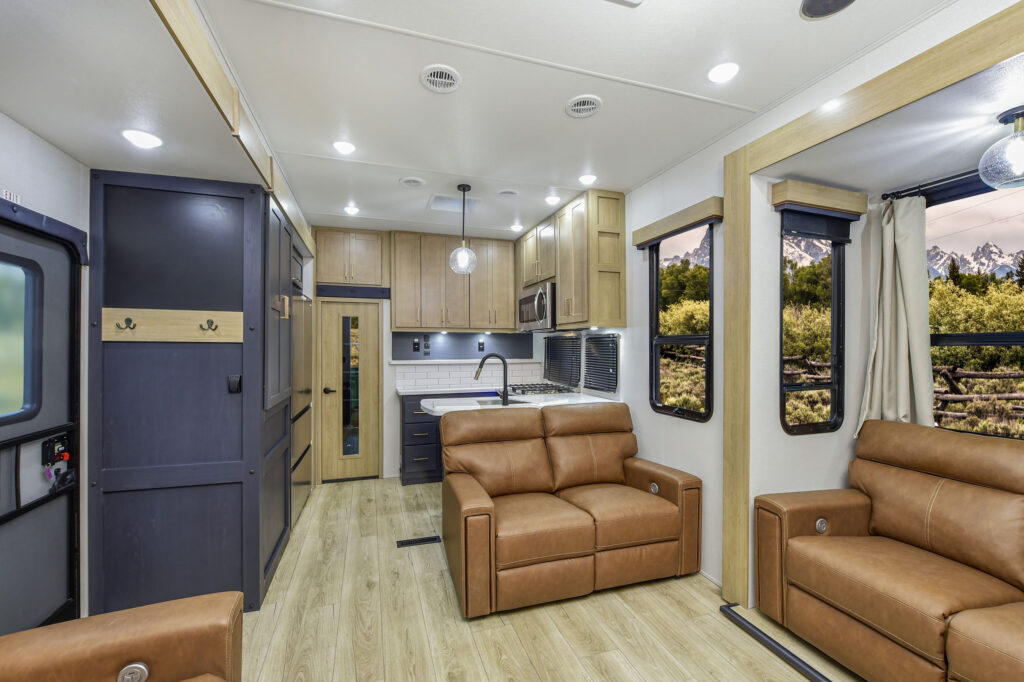 Plus, with an additional outdoor kitchen with a sink and mini-fridge, they can always have cold drinks and snacks on hand outside. And because the front living area is set up a few inches, there’s plenty of room for the Store-More pass-through storage, which can hold 30 percent more cargo than other models. The interior color scheme is light, and tons of windows mean there will always be lots of natural light.
