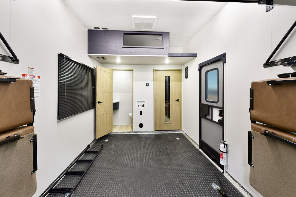 The bunkhouse in the middle of the coach gives Allianna her own private space, with a closet that can be used for clothes or to hold a washer and dryer. The room has a vent for heat and A/C, so it will stay temperate, day or night. A loft over the bunkroom gives Dallas and Dawson a fun, separate space to sleep, study, play, and more.