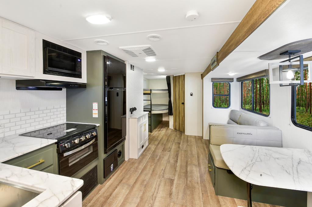 When it comes to comforts, the interiors are all built carpet-free, which makes them easier to dirt-free, and extra large windows open to let in fresh air. A smart TV and Bluetooth speakers give you multimedia entertainment options and the 80-inch ceiling heights are comfortable for even taller campers. The kitchen includes a 10.7 cu. ft. 12V fridge set against infinity-edge pressed countertops, and the 3-burner stove and oven are on hand to help cook your favorite meals. With the farmhouse sink and high-rise faucets, meal prep and cleanup will be a snap.