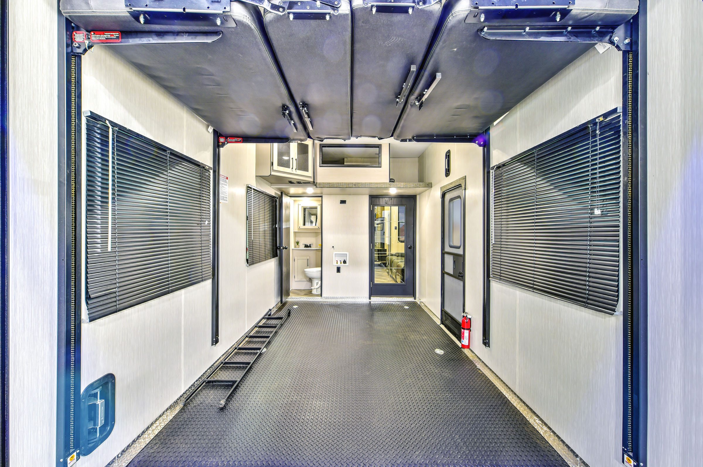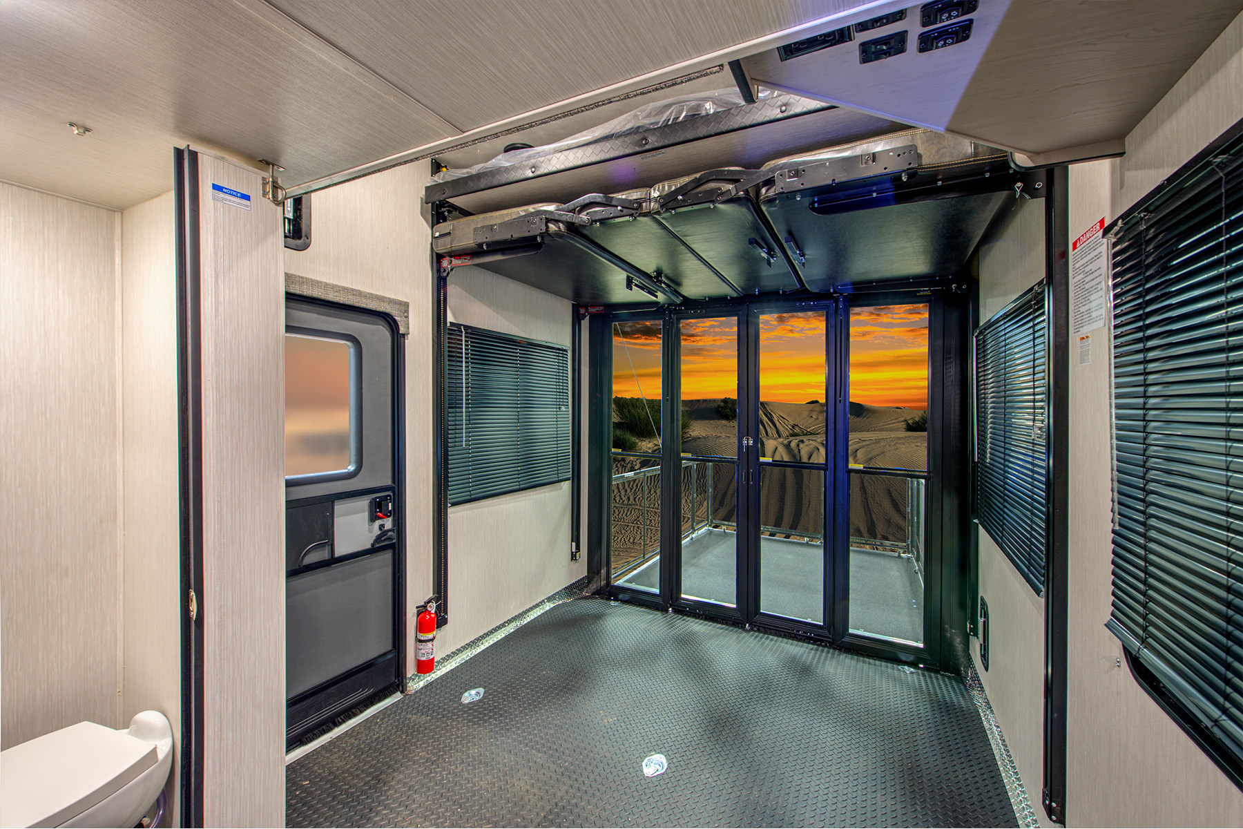 With electric raising beds or overhead lofts, toy hauler garages can become the perfect second bedroom or bunkhouse for kids. That’s why a second half-bath in the garage makes a lot of sense. When you have kids sleeping in the garage space, having a nearby bathroom means less tromping through the coach at night. That’s less noise and inconvenience for everyone. And when you’re traveling with a crowd – multiple kids, plus the friends you graciously allowed them to bring – having a second bathroom is a practical choice. With one bathroom, someone taking a shower ties up the facilities. With two, everyone’s happy.