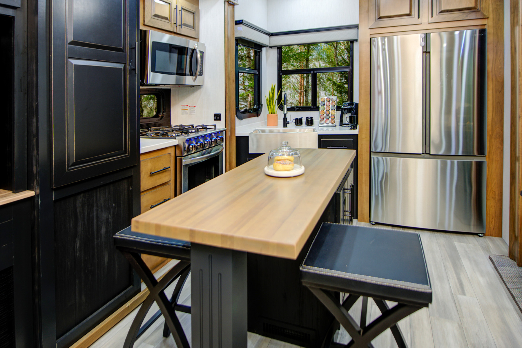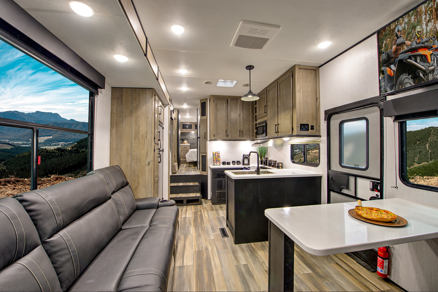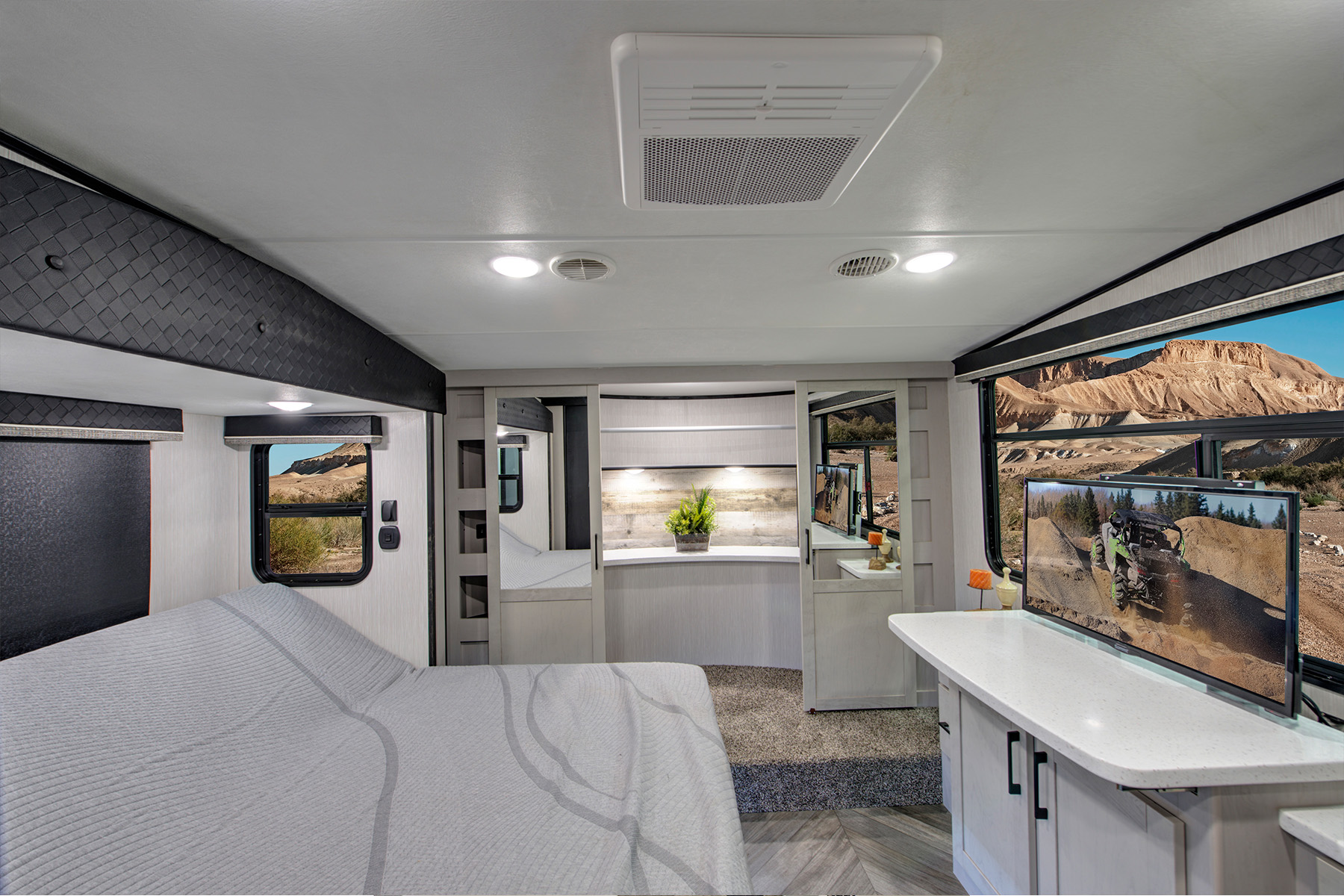 While the Bighorn Traveler 39MB and Elkridge 38MB don’t have built-in desks, they do feature middle bunkhouses behind a door. Both rooms include secondary televisions, giving you the flexibility to use them as a playroom or nap room for young kids, a place where teens can keep themselves entertained on rainy days, or a quiet room where you can take a private work call. Both models include wireless charging pads, and the Elkridge also comes with a Winegard Air 360+ antenna with WiFi prep, which lets you access the internet or cell service within a 55-mile range.