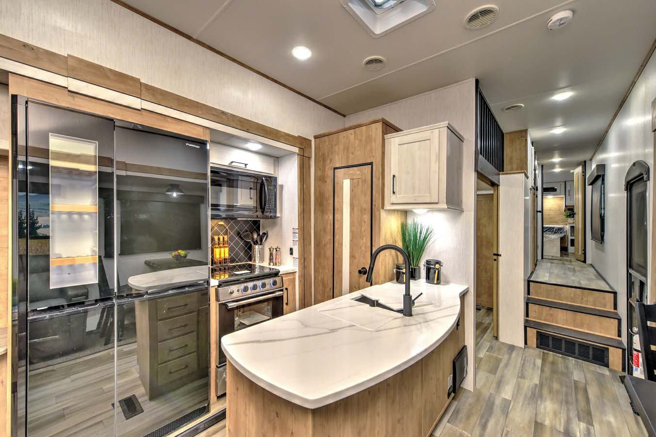 If you’re looking for a luxurious fifth-wheel model with a less conventional layout, we’ve got some great options for you. First up, check out the Milestone 321FL. With an extra-large sectional-style sofa and an elevated counter with three stools, you can work from a comfy couch or use the counter as a standing desk when you want to stretch your legs. It also includes WiFi prep and wireless charging ports, as well as a 50W solar panel with inverter prep.