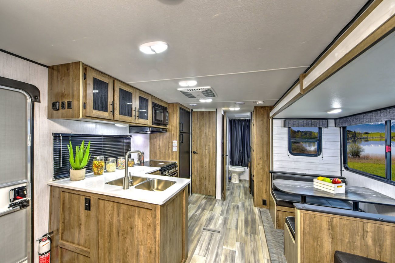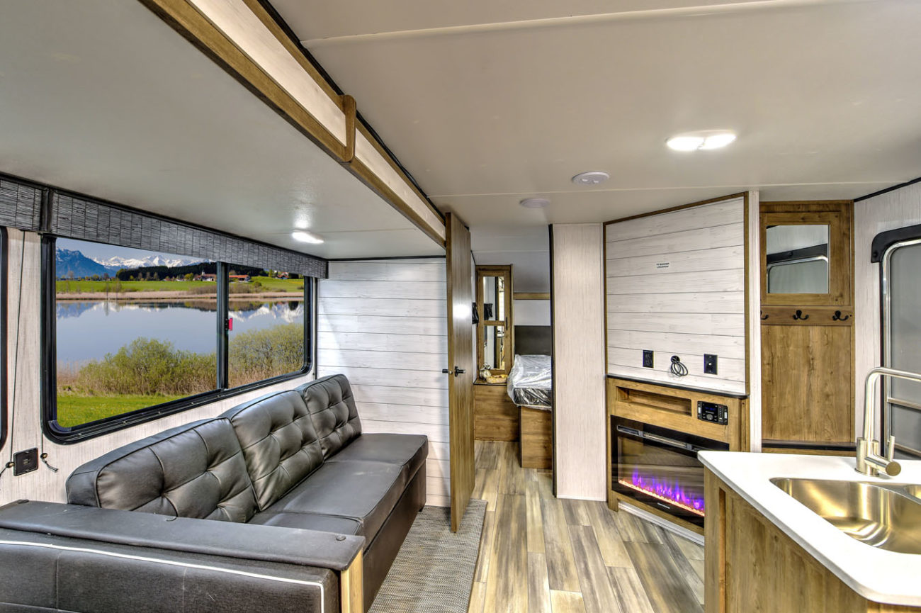 Explore new territory in one of the many travel trailer models that Pioneer RVs have to offer. Constructed to be dependable with a smart design, you’ll find features you may not expect, like an 8 cu. ft. gas/electric refrigerator with chalkboard front and fireplaces in select Pioneer travel trailer floor plans. Or the handy flip-down storage rack, which keeps items like bikes, wood and coolers outdoors.