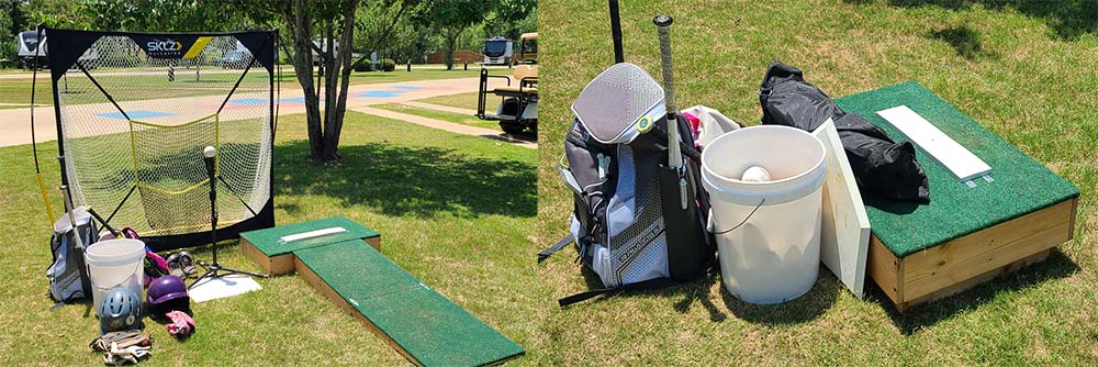 Our son is really into baseball, so we travel with a custom built pitching mound, pitching net, baseball bags and a bucket of balls. It all packs down to take up less space, and we store it in our cargo bay when it’s not being used. This photo shows all of the gear fully opened, and then the photo on the right shows how small we can pack it up! If your child enjoys a particular sport or activity, it IS possible to make room for their important sports equipment!