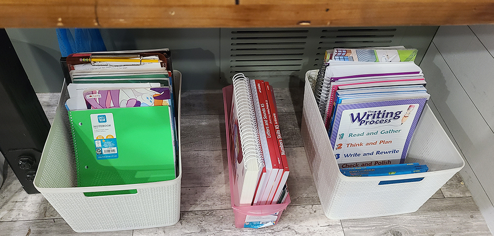 We use a workbook based curriculum so we have a lot of school books. It's been successful for us to keep a few tote bins under our kitchen table (where most of our school work happens) to hold the books and teacher guides. We also use small Sterlite stackable bins for pencils, markers, and colored pencils in the cabinet by the table.