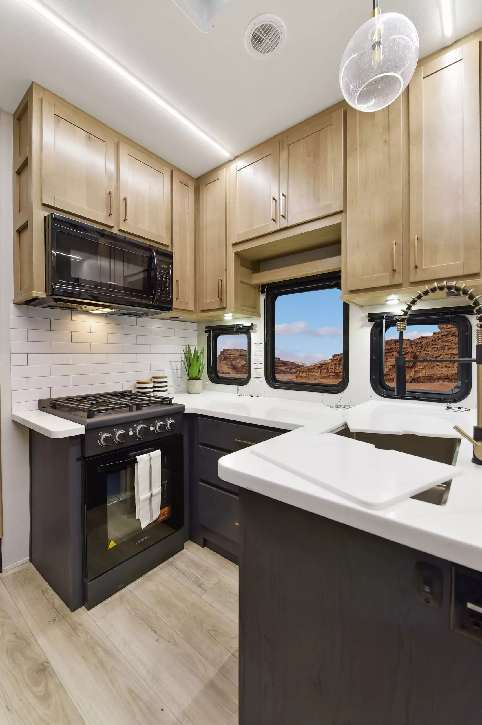 • Culinary Kitchen workspace most countertop space in class along with residential microwave and massive 24” stand alone oven with 4 burners, and solid surface sink covers
