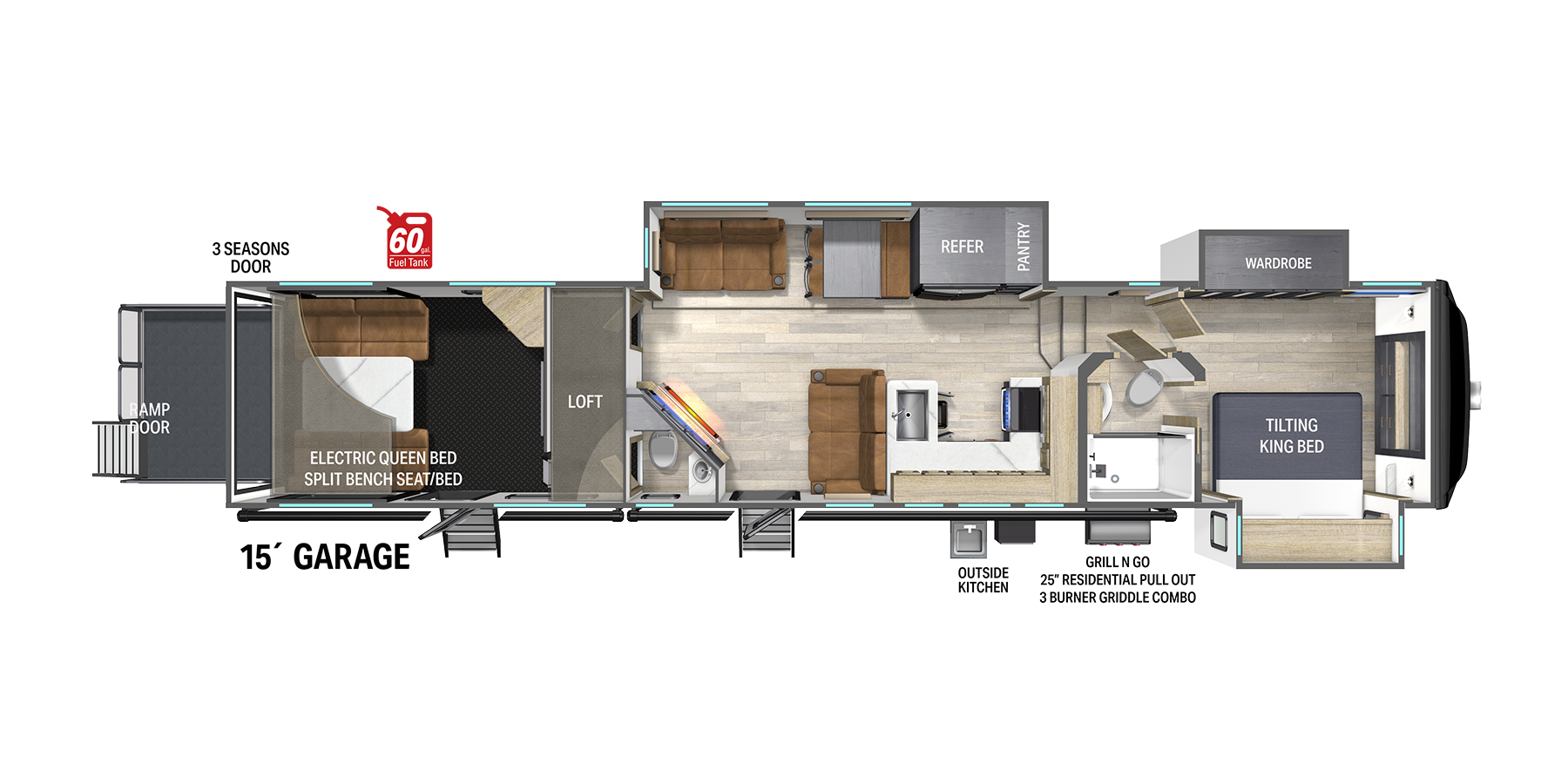 • Dry Camp Longer with the industry’s largest freshwater tanks at 150 gallons capacity.