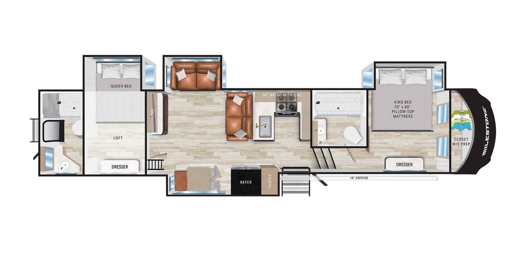 - Chef kitchen (30˝over the range microwave/21˝ large RV oven)