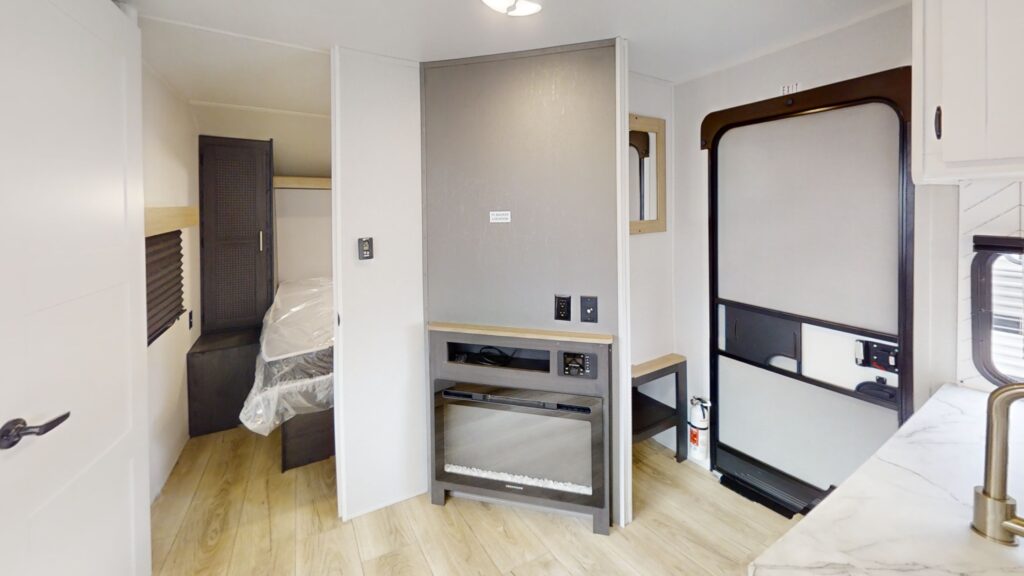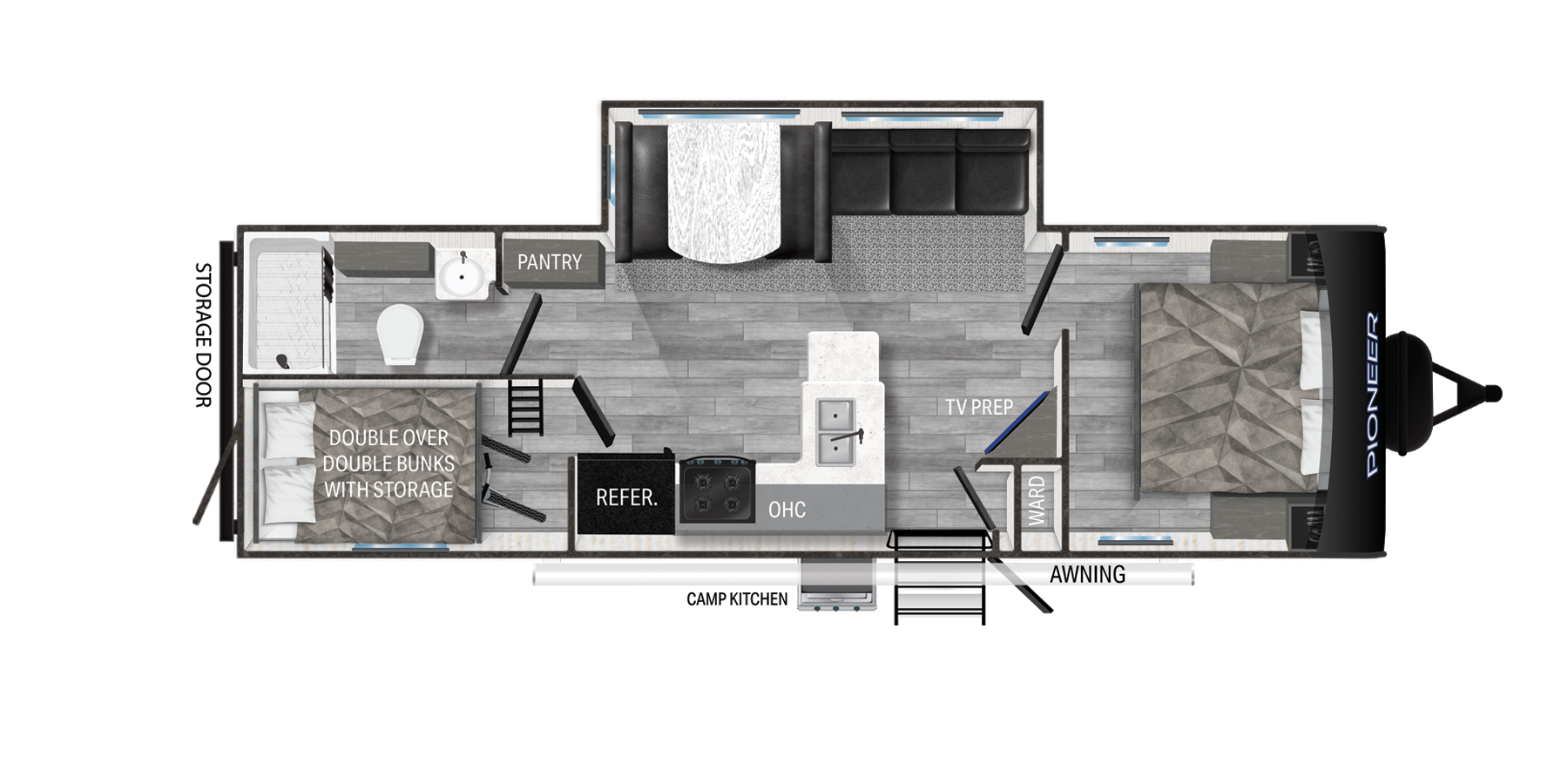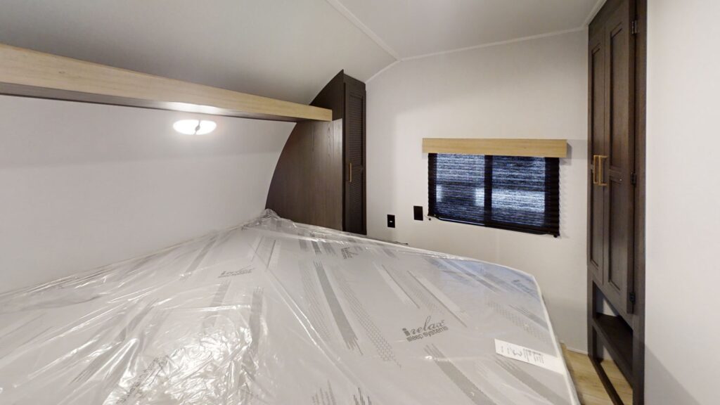 - Pioneer Master Suite including a full size residential queen bed (60”x80”), full length dual wardrobes with integrated lighting and USB charging, CPAP ready storage with full power access