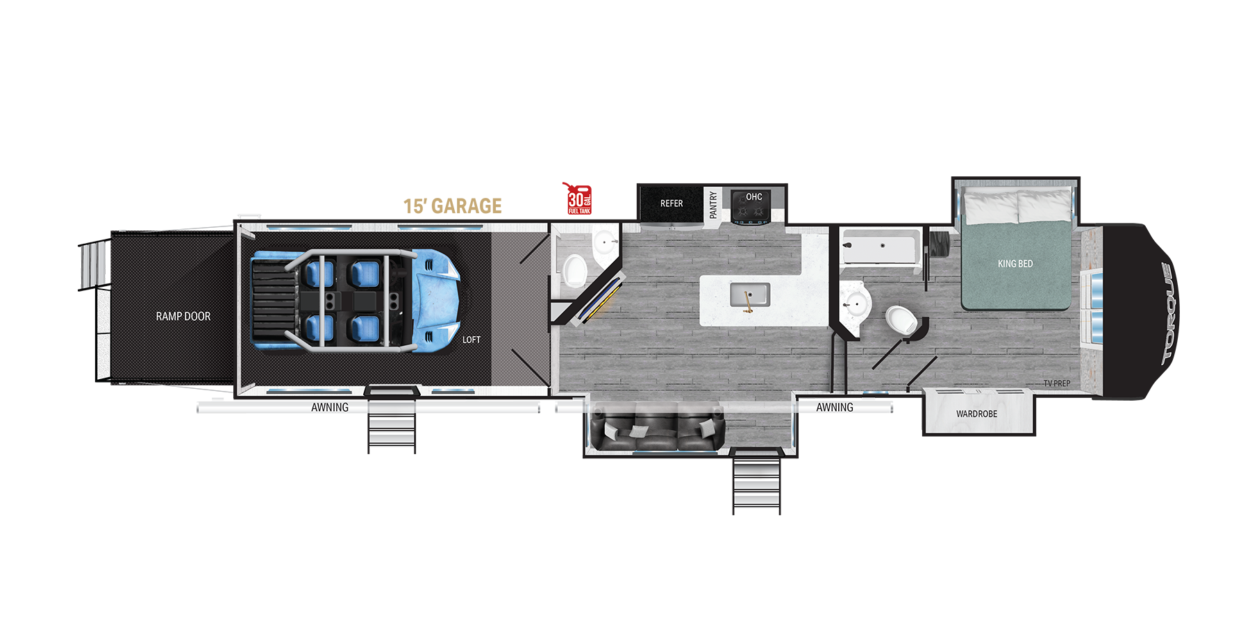 - Ramp door patio with rear electric awning with LED lights