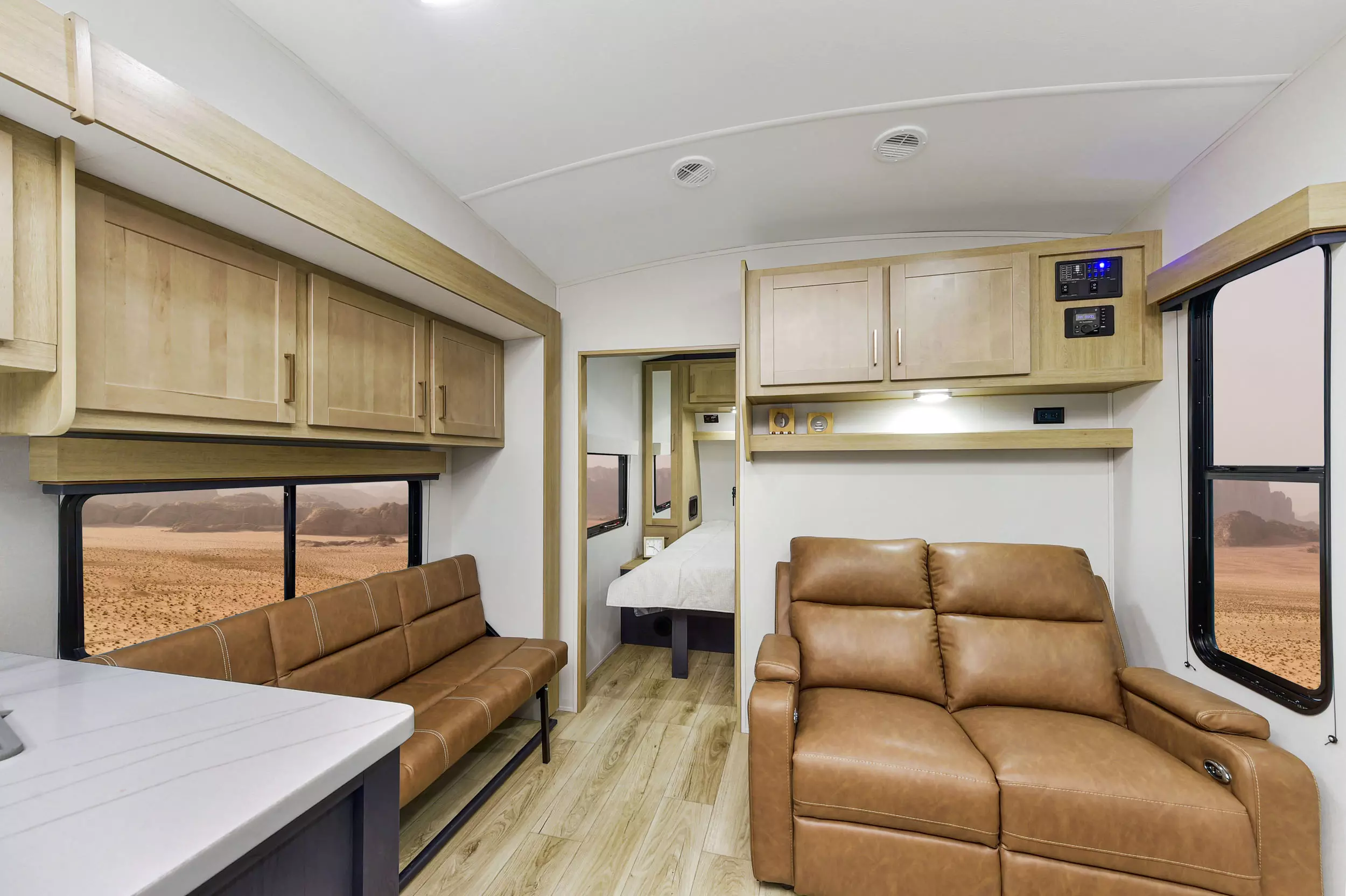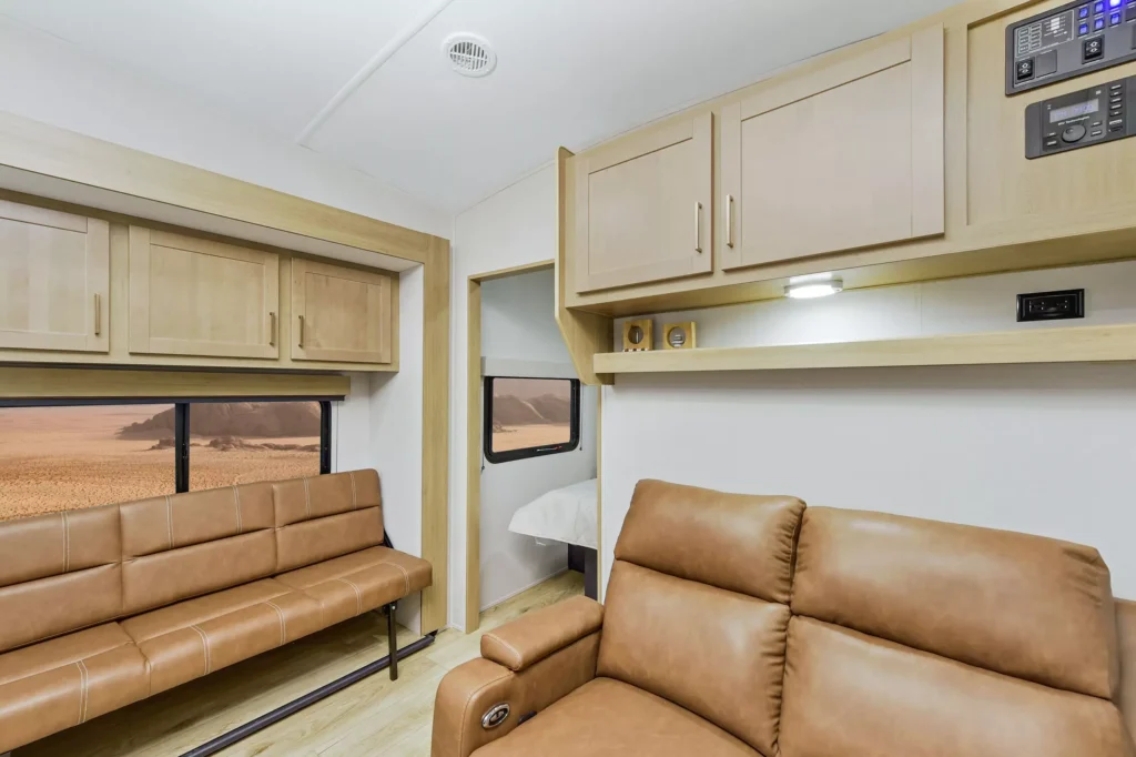 - Rear electric queen bed with convertible sofa