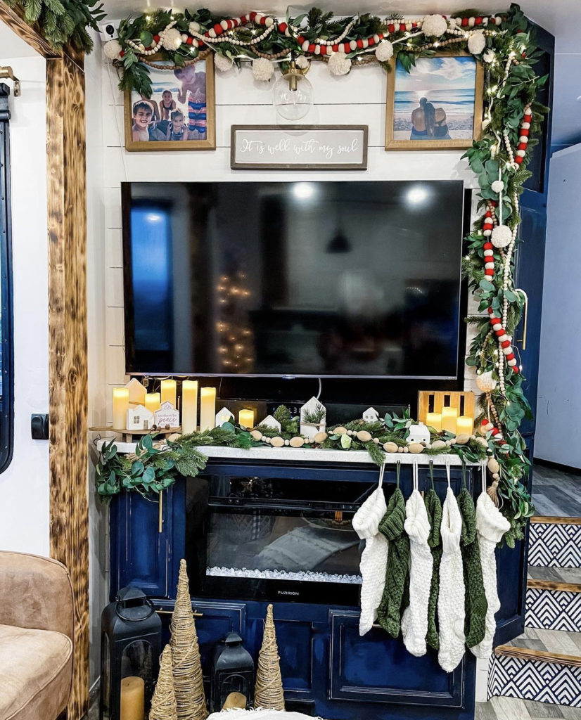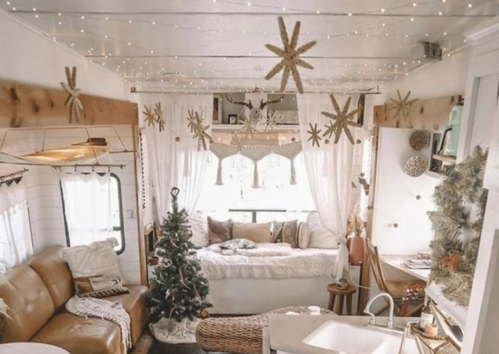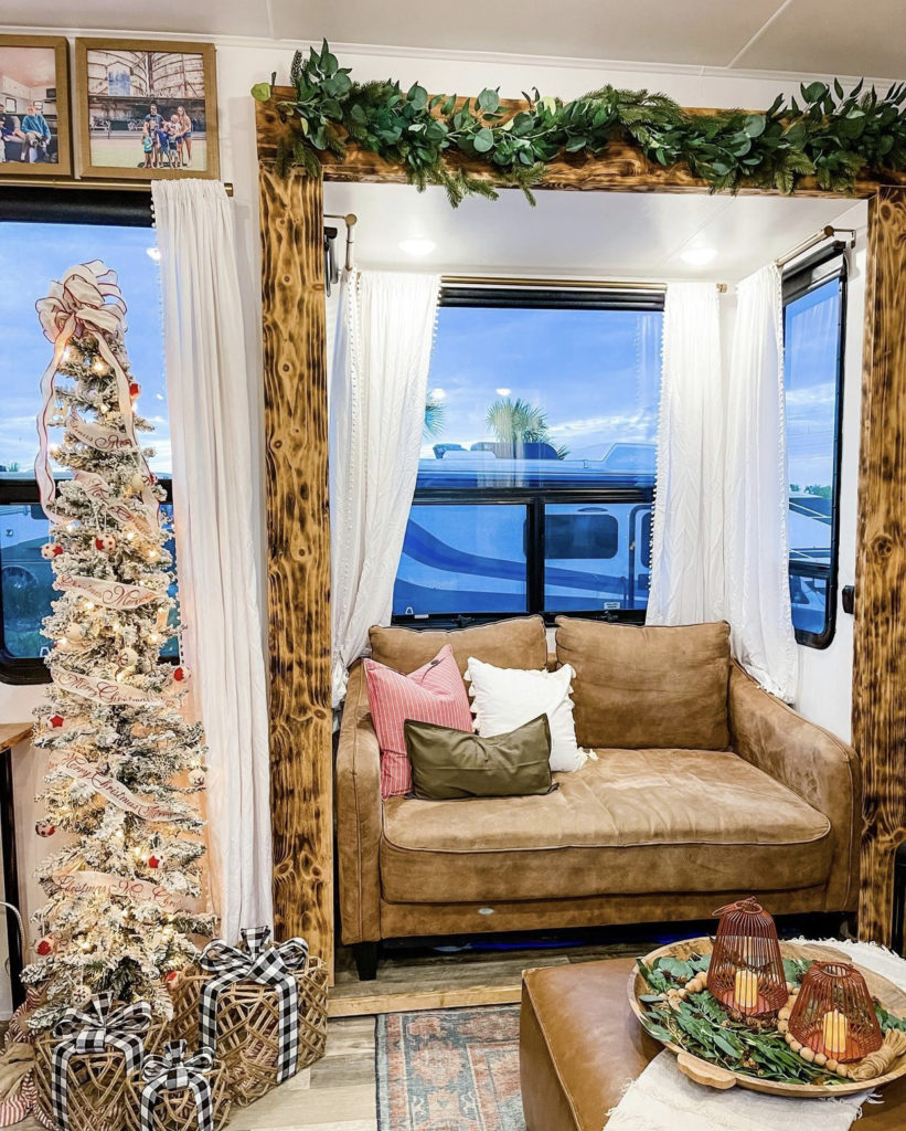 - Hang a cheery wreath on the front door; it is on the outside and out of the main space. It will bring a smile to everyone around the campground.