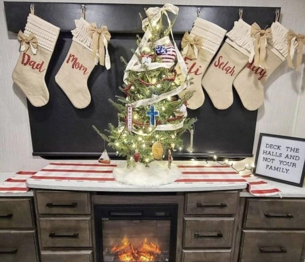 - Step into the Holiday with Christmas rugs. These can be thrown throughout the RV in all the spaces. They bring that joyful Christmas spirit, and they serve a useful purpose.